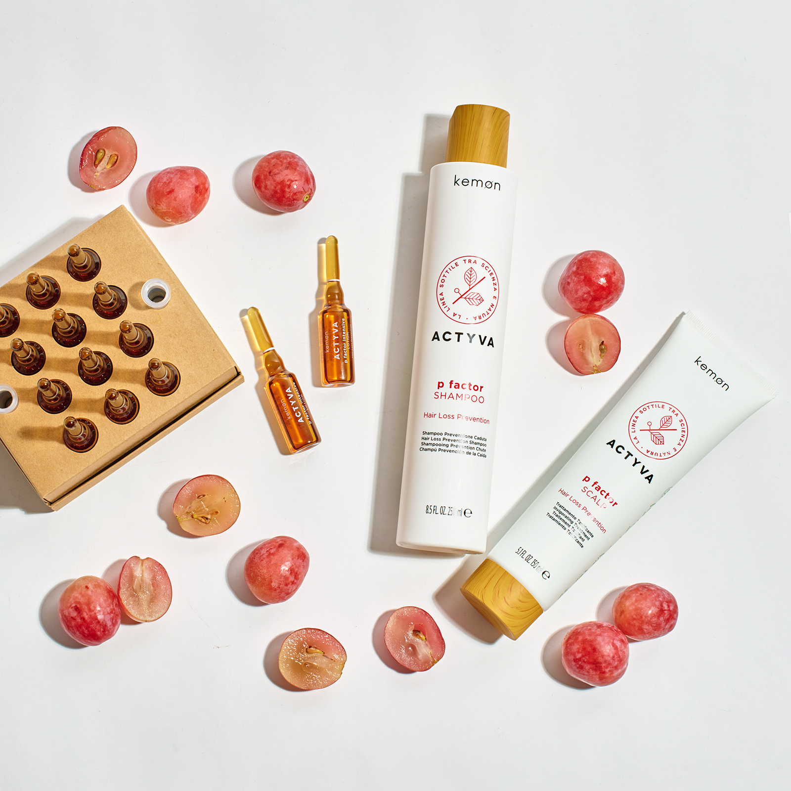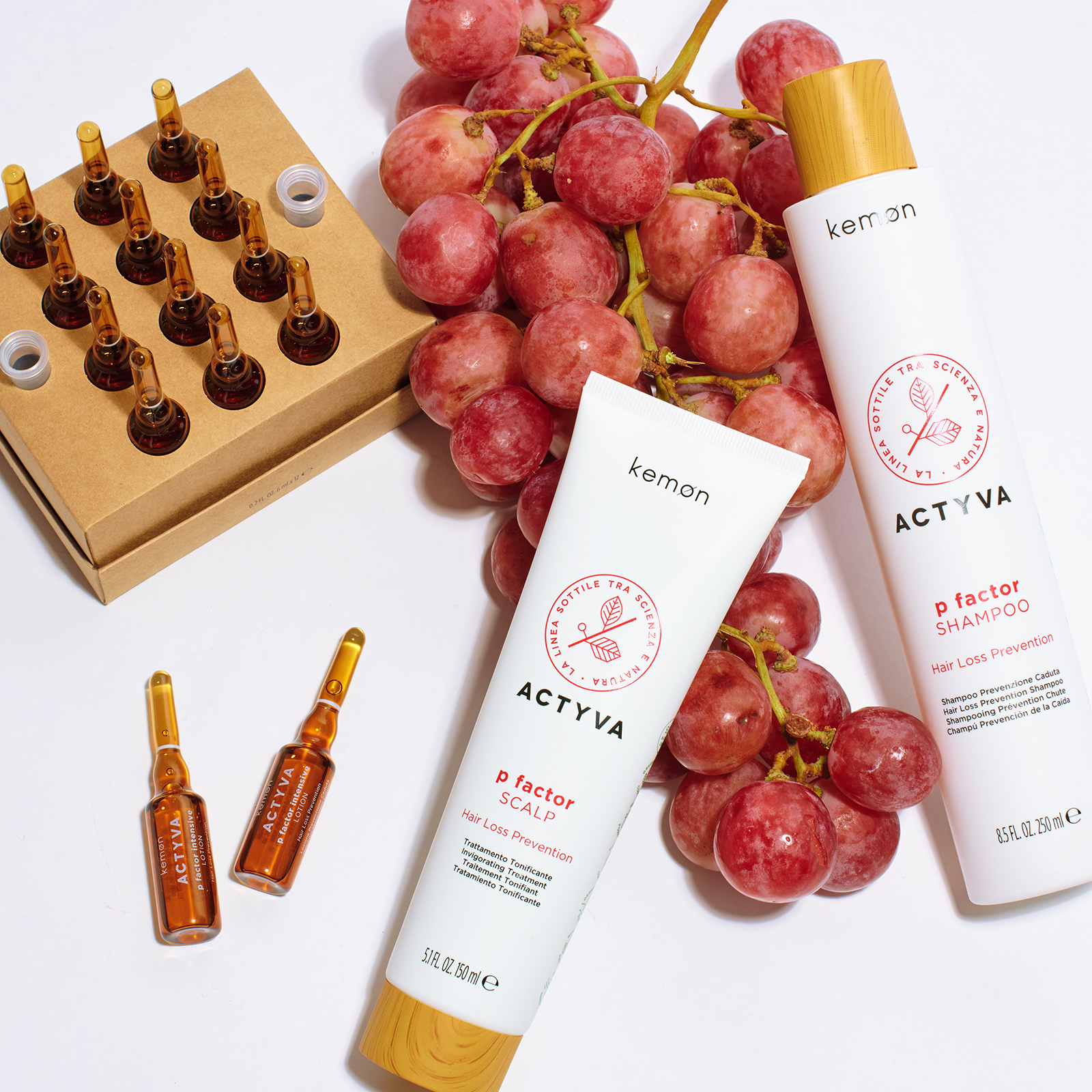 Ключевой компонент линии –PF Complex. Это инновационный комплекс на основе стволовых клеток виноградных ягод, экстракта лиственницы и чая, обладающих антиоксидантным эффектом, кофеина, стимулирующего микроциркуляцию кожи головы, глицина и цинка с укрепляющим действием, освежающего ментола.